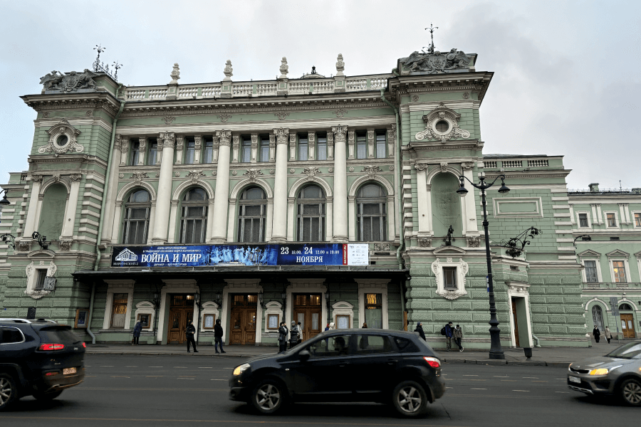 遠くにマリインスキー劇場が見えてきます。ユネスコの世界遺産にも登録されている美しくも荘厳な建造物です。