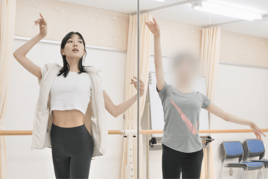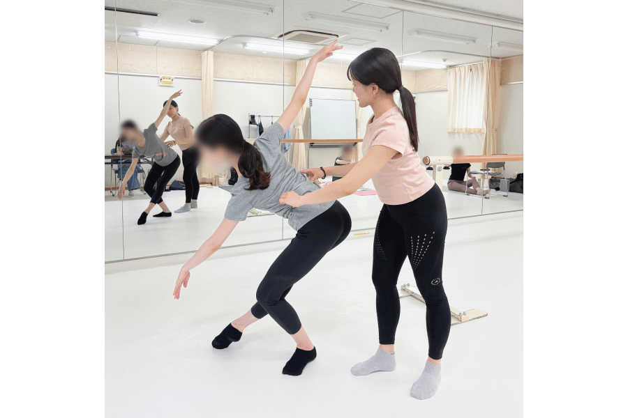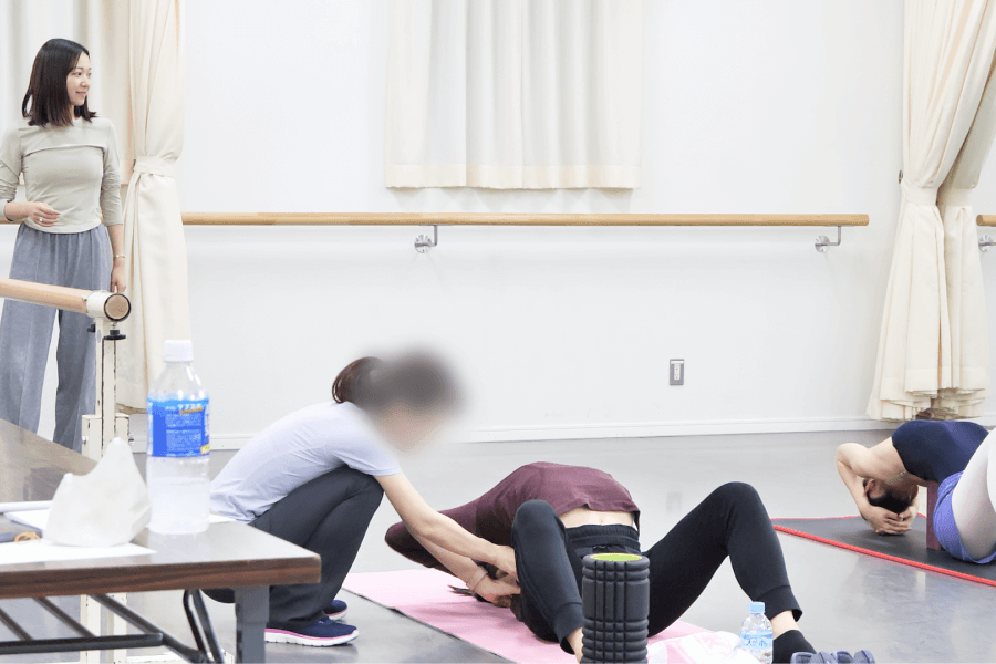 研修は基礎を徹底的に見直すという意味合いもあるので、ストレッチやリリース、筋トレを併用しながら体を整えていきます。立ち方や胸椎の動き、特に上半身の体現を何度も繰り返して、そこから顔の付け方や腕のライン、指先への意識までつなげるようにしていきます。