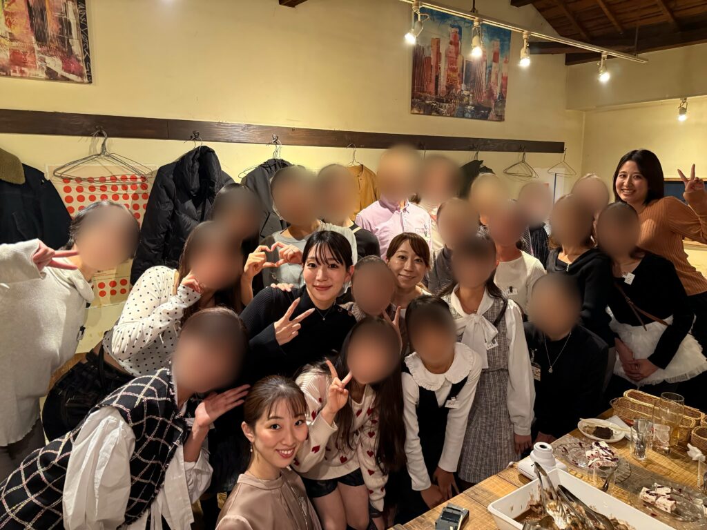 薄暗くオシャレな空間に、先生と参加者の笑顔が並びます。ゴールドのボタンがきらめく黒のハイネック×ミニスカート姿の久美子に、会場からは思わず歓声があがりました。